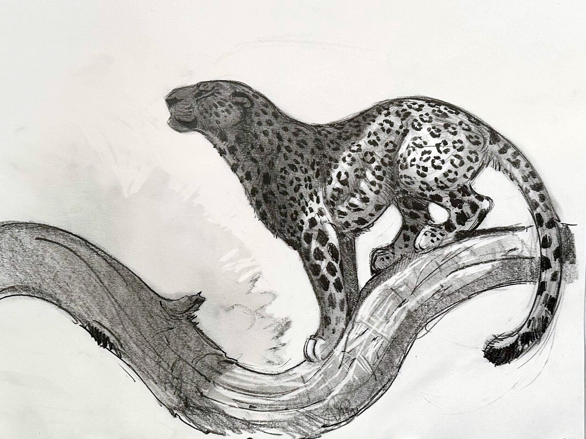 In this drawing, the curve of the branch helps frame the animal’s posture, creating a dynamic composition while still maintaining the loose immediacy of a graphite study.