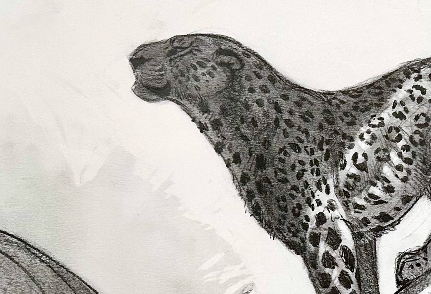Leopard in Tree captures one of the most recognizable behaviors of this remarkable animal — resting or surveying its surroundings from the safety of a branch. The drawing combines expressive graphite shading with confident linework to describe the leopard’s muscular form and distinctive spotted coat.